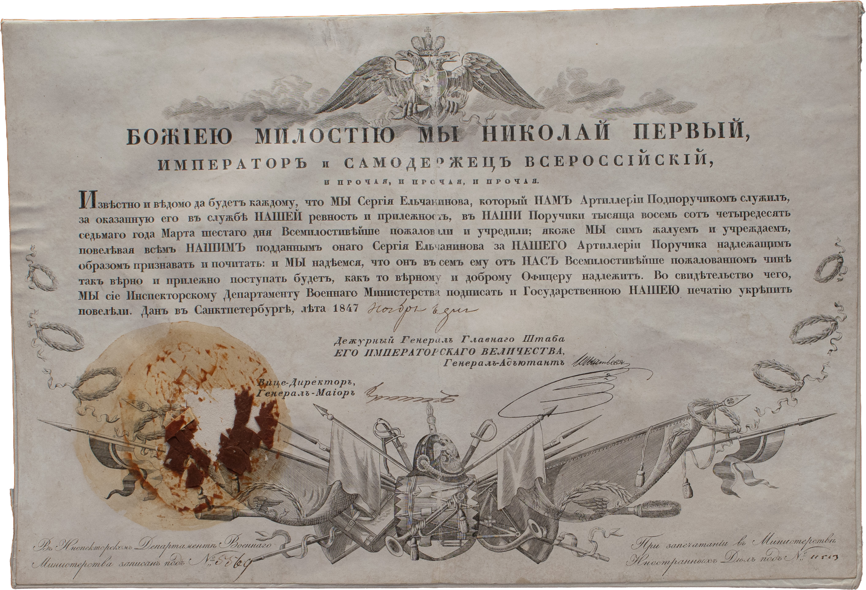Патент Сергея Ельчанинова на чин поручика. Подписи дежурного генерала Главного штаба Его Императорского Величества генерал-адъютанта П.Н.Игнатьева и вице-директора инспекторского департамента Военного министерства генерал-майора NN (автографы). Государственная печать. С.-Петербург, 6 ноября 1847 г. Бумага, чернила, сургуч; печать типографская, рукопись. Размеры 225×335 мм. Сохранность почти отличная, патент продублирован на картонную основу, сургуч практически утрачен. Редкий.
