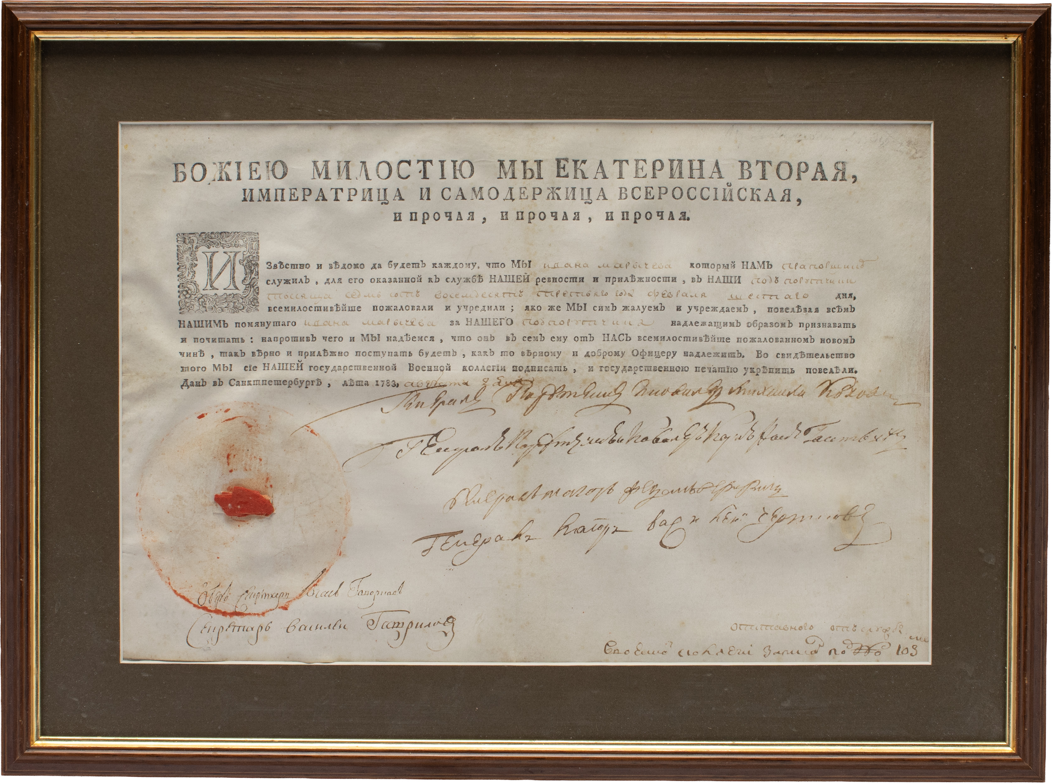 Подписи генерал-поручика М.В.Каховского, генерал-поручика К.Е. фон Гантвига, генерал-майора Ф.М.Веригина и генерал-майора В.А.Черткова (автографы). С.-Петербург, 2 августа 1783 г. Бумага, чернила; печать типографская, рукопись. Сохранность очень хорошая, сургучная печать утрачена. «Известно и ведомо да будет каждому…». Книги записи патентов, выданных Военной коллегией в 1723–1796 гг. Регест в 2-х томах. Т. 2. М., 2020. С. 1107. Патент вставлен в раму со стеклом и паспарту. Размеры рамы 296×399 мм. Довольно редкий.
