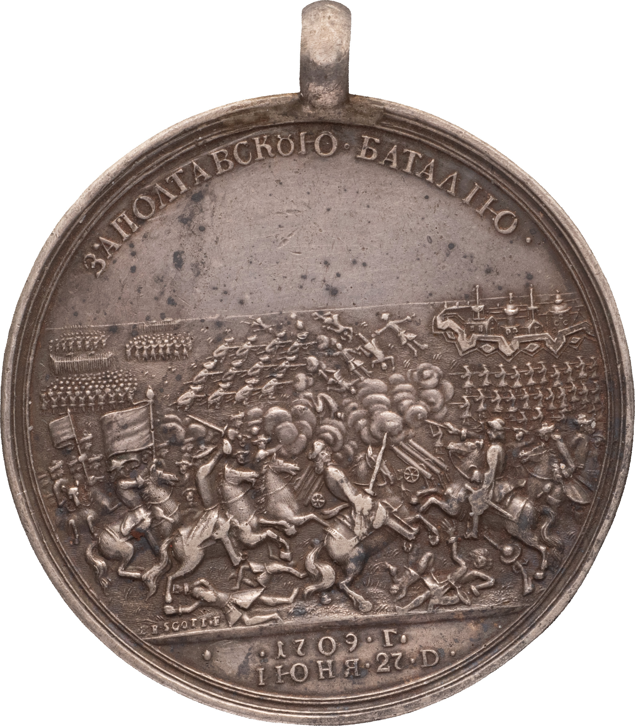 Наградная унтер-офицерская медаль за сражение при Полтаве, 27 июня 1709 г., новодел. СПб монетный двор, середина XVIII в. Медальеры: лиц. ст. — С.Ю.Юдин (внизу на поле: С·Ю·), об. ст. — Б.Скотт (слева над линией обреза изображения: B·SCOTT· F). Серебро, 55,09 г. Диаметр 47,4 мм. Сохранность очень хорошая, красивая патина, вверху медали припаяно ушко. Иверсен# XXIV.1.а. Смирнов# 182. Дьяков# 27.2 (R1). Соколов# 060.а.2.К. Великие Русские победы в медали и гравюре, 1709. # 301–305. Биткин (медали)# К170 (R3). Редкая.