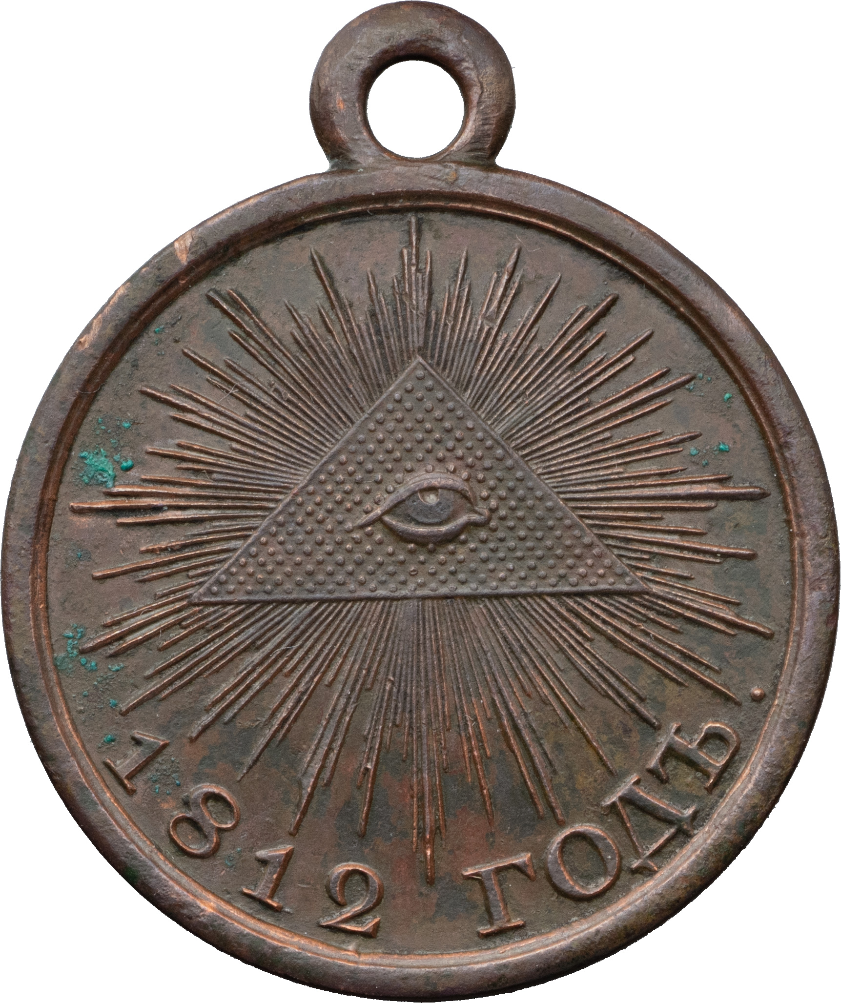 Медаль в память Отечественной войны 1812 года. СПб монетный двор, 1814–1823 гг. Медальер К.А.фон Леберехт (без подписи). Темная бронза, 12,46 г. Диаметр 28,5 мм. Сохранность очень хорошая, следы окисления. СРМ# 292. Смирнов# 369/а. Петерс# 59. Дьяков# 358.1 (R1). Биткин# 635.А (R).