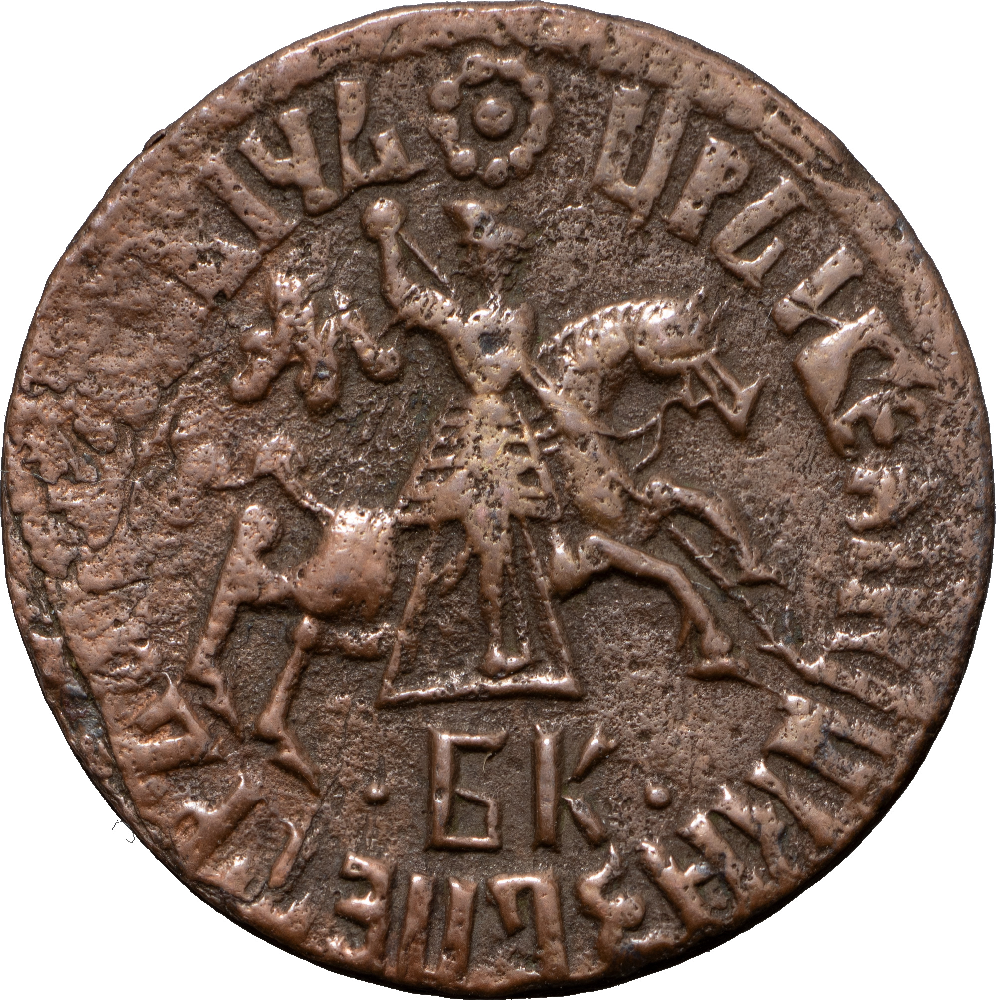 Лжедмитрий I (1605–1606 гг.). Копейка 1605–1606 гг. с именем Дмитрия Ивановича. Псковский денежный двор. Лиц. Ст.: буквы «ПС» под всадником. Серебро 0,67 г. Сохранность очень хорошая, тёмная патина.