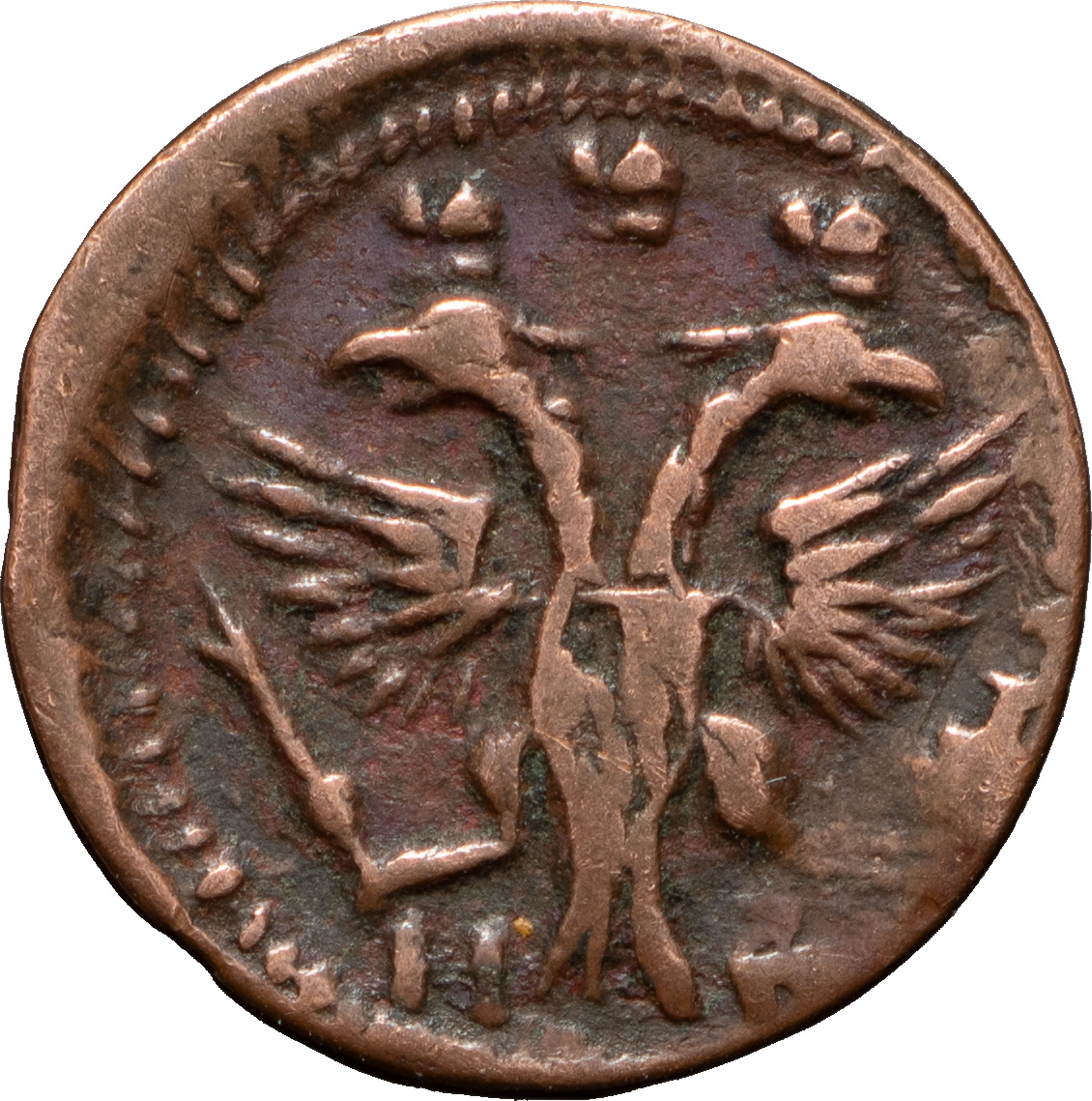Полушка 1719 года, НД. Лиц. ст.: над орлом три короны без крестов, хвост орла узкий. Об. ст.: «ВРП», дата славянскими буквами, короны нет. Медь, 0,77 г. Сохранность очень хорошая, приятная сухая патина. ГМ# нет. Brekke# 63. Уздеников# 2412. Дьяков# нет. ДьяковММ# 3966 (R0), вар. Биткин# нет.