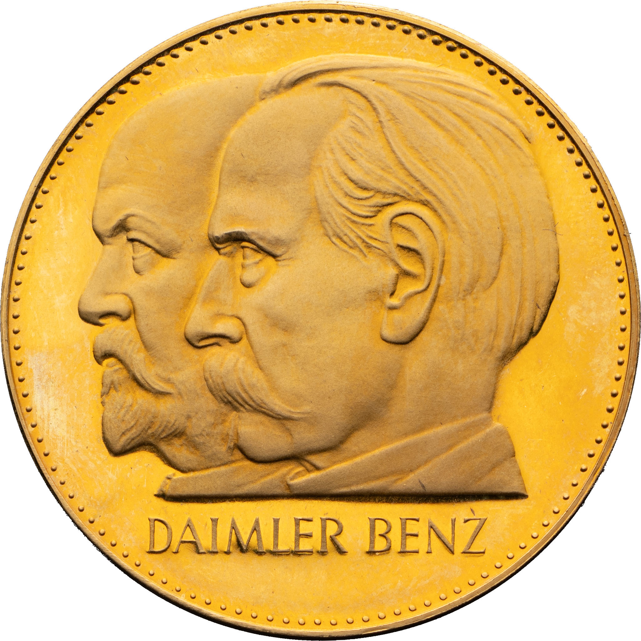 Медаль в память 75-летия моторизации транспортных средств, по заказу фирмы Даймлер-Бенц AG. ФРГ. Мюнхен, Баварский монетный двор, 1961 г. Медальер с инициалом R (Karl Roth ?). Золото 900-й пробы; 34,95 г. Диаметр 40,2 мм. Чеканка полированными штемпелями с матированием. Сохранность отличная, медаль вложена в оригинальную коробку с бархатным ложементом и изображением логотипа фирмы Mercedes-Benz на внутренней стороне крышки.