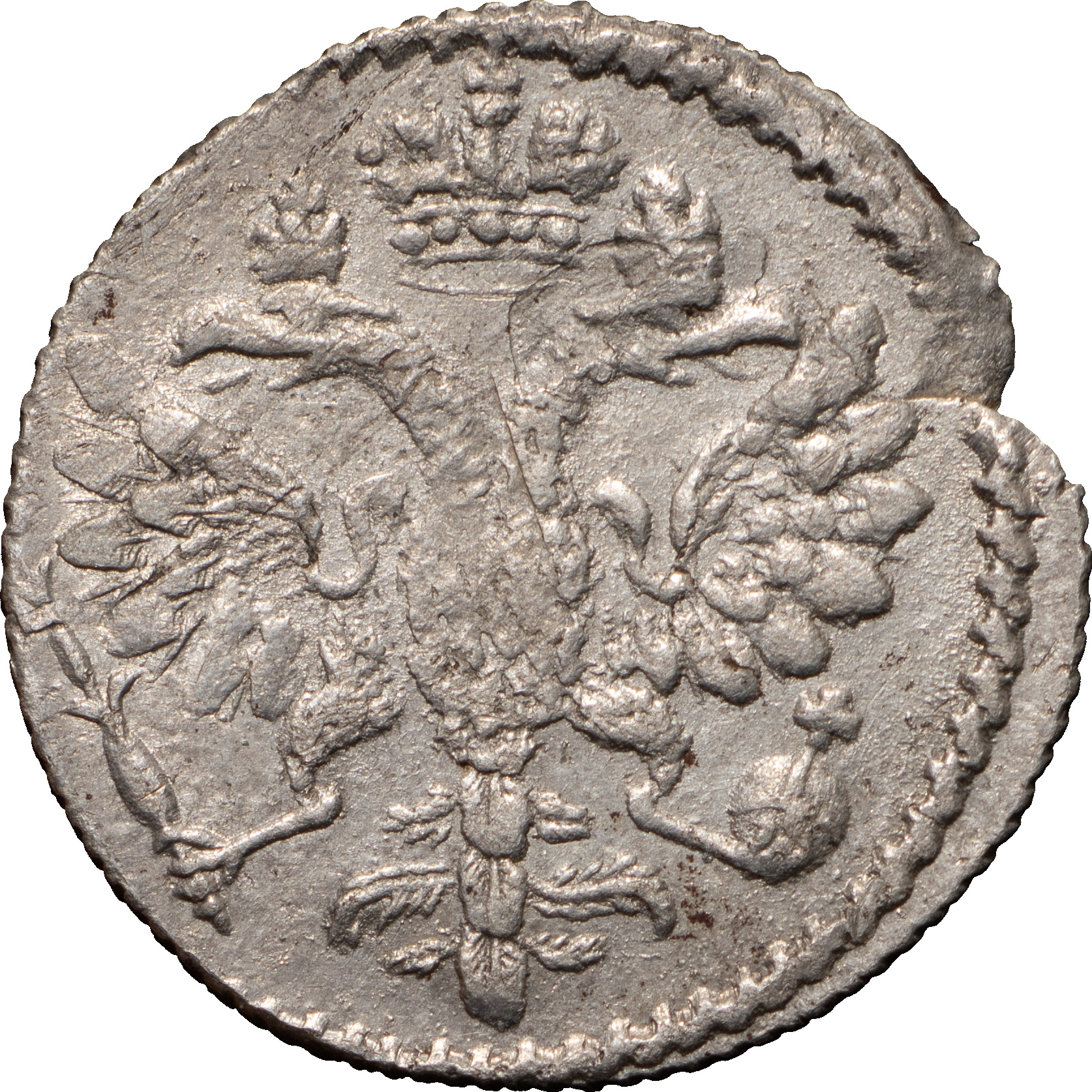 Гривна 1726 года, СПБ. Лиц. ст.: центральная корона средняя. Серебро, 2,55 г. Сохранность почти отличная, приятная патина, слоение металла заготовки. ГМ# 13.20, вар. Severin# 770 (точка). Уздеников# 0661 (черта с точкой). Дьяков# 6, вар. Биткин# 226 (R1), вар. Очень редкая, 8 рублей по Ильину, 10 рублей по Петрову.