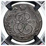 5 копеек 1782 года, КМ. Медь. Монета в пластиковой капсуле (слабе) RNGA, AU 58 BN. ГМ# 23.6. Brekke# 247. Уздеников# 2757. Дьяков# 450. Биткин# 783. Довольно редкие, 50 копеек по Петрову.