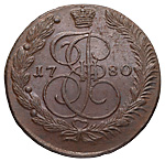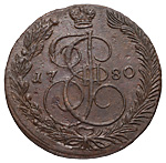 5 копеек 1780 года, ЕМ. Медь, 60,66 г. Сохранность отличная, приятная патина, небольшой дефект гурчения. ГМ# 22.5. Brekke# 240. Уздеников# 2750. Дьяков# 410. Биткин# 631.