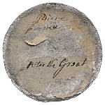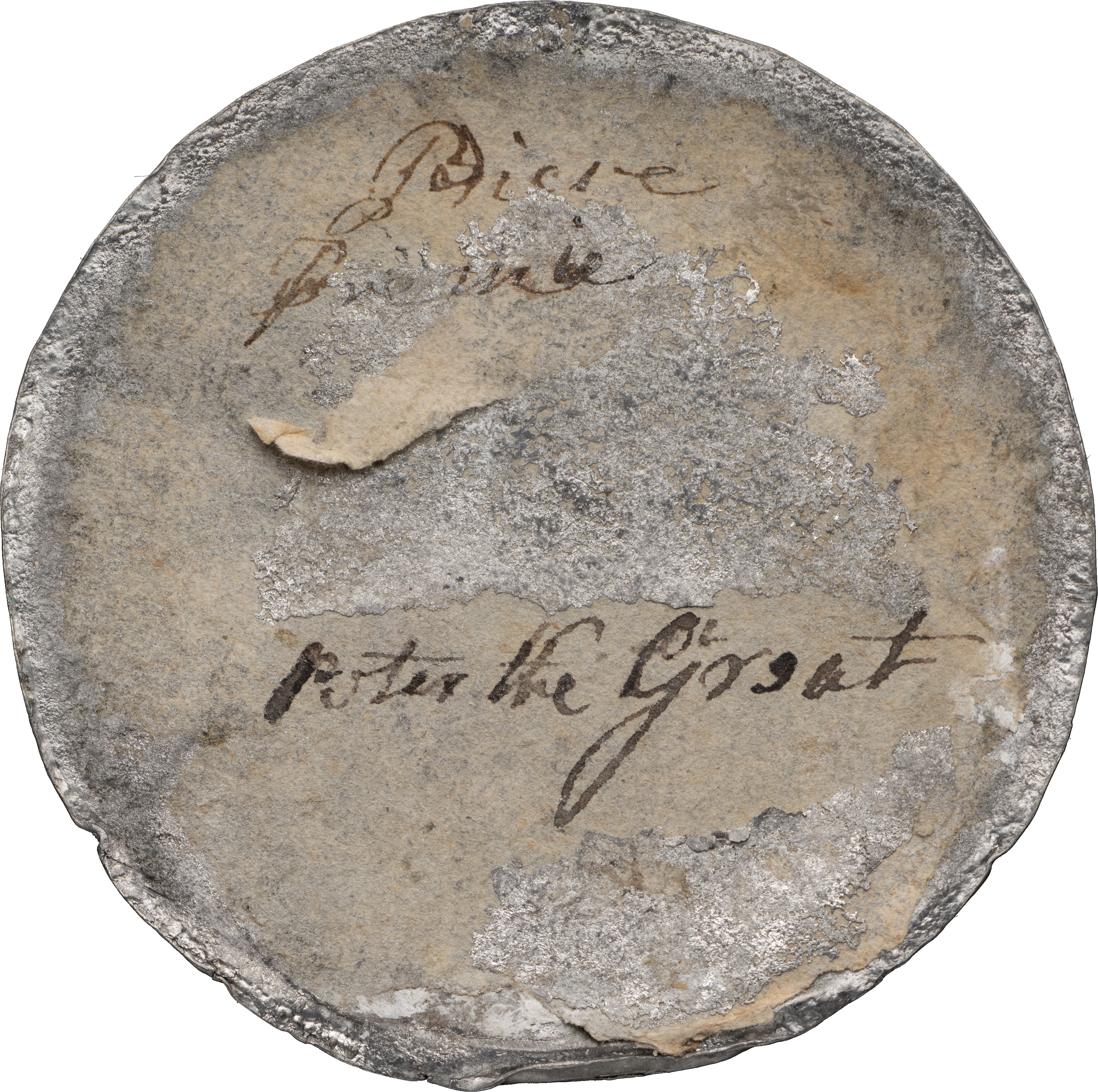 Медаль в память взятия Шлиссельбурга, 12 октября 1702 г. Оттиск штемпеля лицевой стороны. СПб монетный двор. Медальер С.Ю. Юдин (на обрезе правой руки в три строки: •С• / ЮДИН•F. / вы. — 1767.). Свинцово-оловянный сплав (гарт); 28,30 г. Диаметр 70 мм. Дьяков# 15.3. Сохранность очень хорошая.