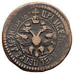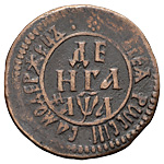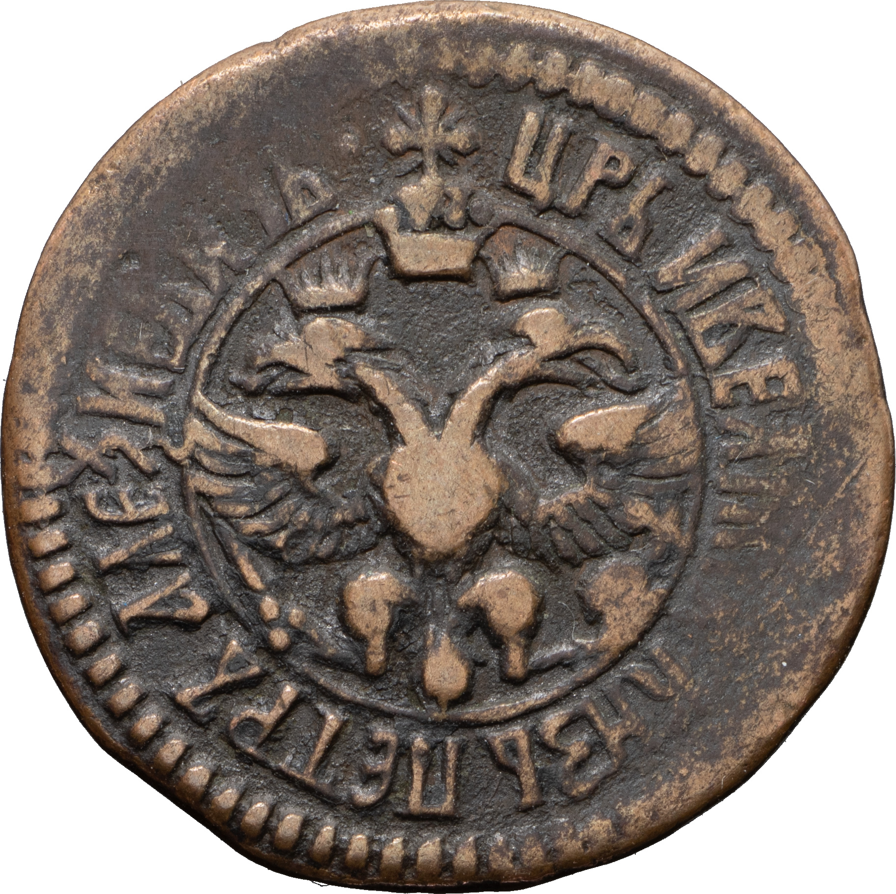 1 копейка 1705 года, МД. Лиц. ст.: вверху розетка, ножка буквы «М» усечена. Об. ст.: вверху точка слева от креста, в обозначении даты буква «Е» в виде «F». Медь, 8,69 г. Сохранность очень хорошая, темная рыхлая патина, царапина. ГМ# 23.36. Brekke# 166. Уздеников# 2273. Дьяков# 78. ДьяковММ# 2072 (R0). Биткин# 3313.
