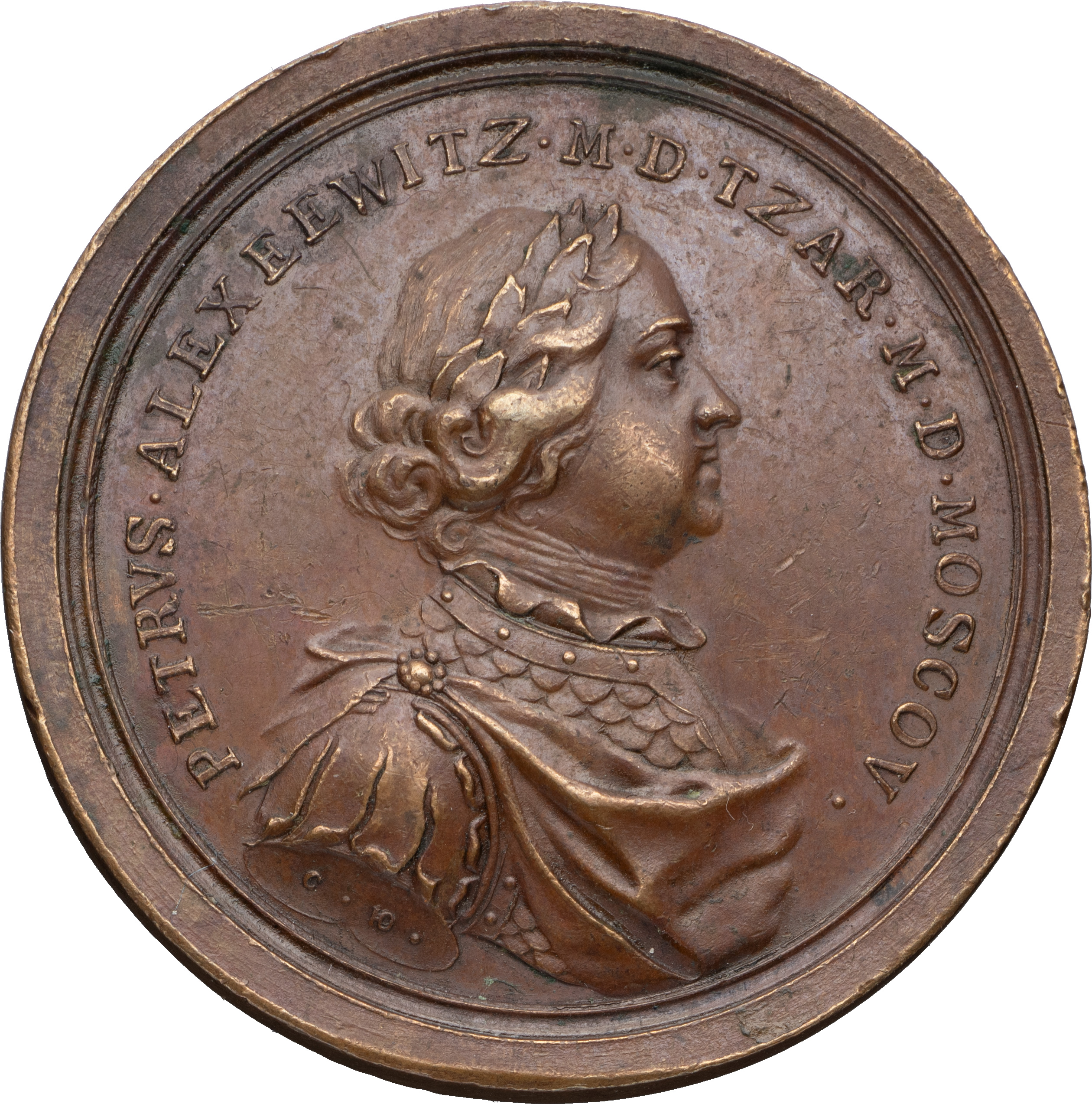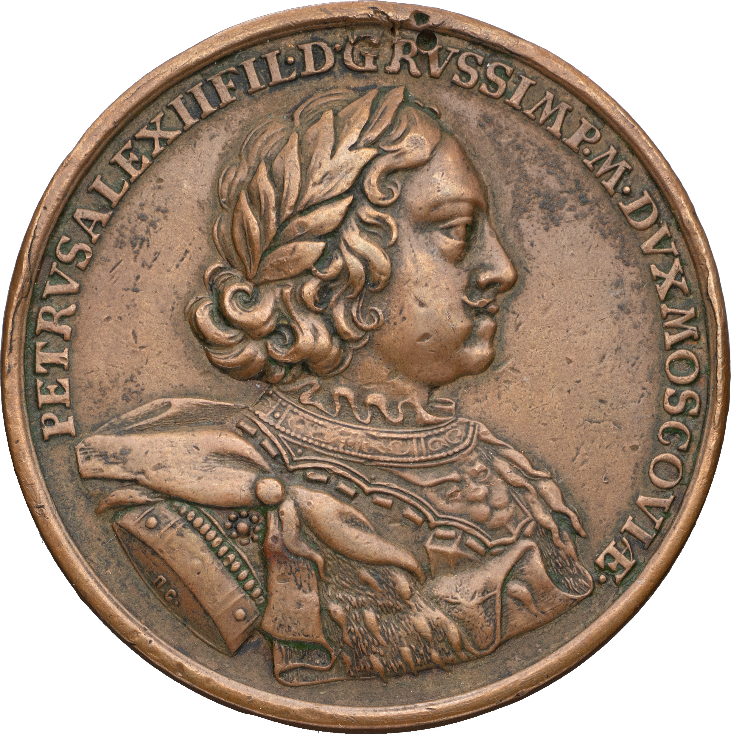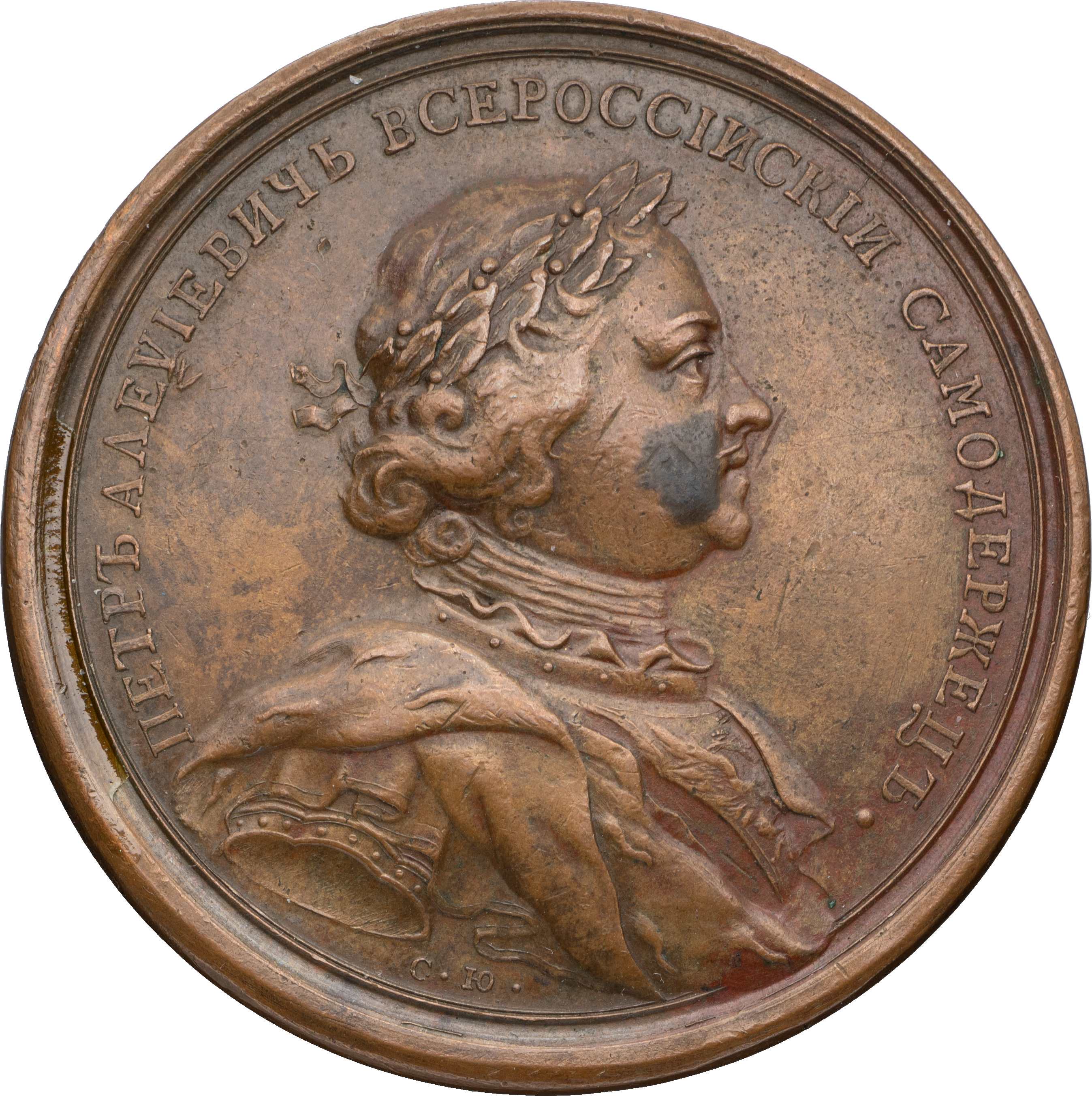 Наградная унтер-офицерская медаль за сражение при Полтаве, 27 июня 1709 г., новодел. СПб монетный двор, середина XVIII в. Медальеры: лиц. ст. — С.Ю. Юдин (внизу на поле: С·Ю·), об. ст. — Б. Скотт (слева над линией обреза изображения: B:SCOTT·F·). Бронза; 58,73 г. Диаметр 51,3 мм. Иверсен# XXIV.1.а. Смирнов# 182. Дьяков# 27.2. Соколов# 060.а.2.К (R). Великие Русские победы в медали и гравюре, 1709. # 301–305. Биткин (медали)# К170 (R). Сохранность очень хорошая. Довольно редкая.