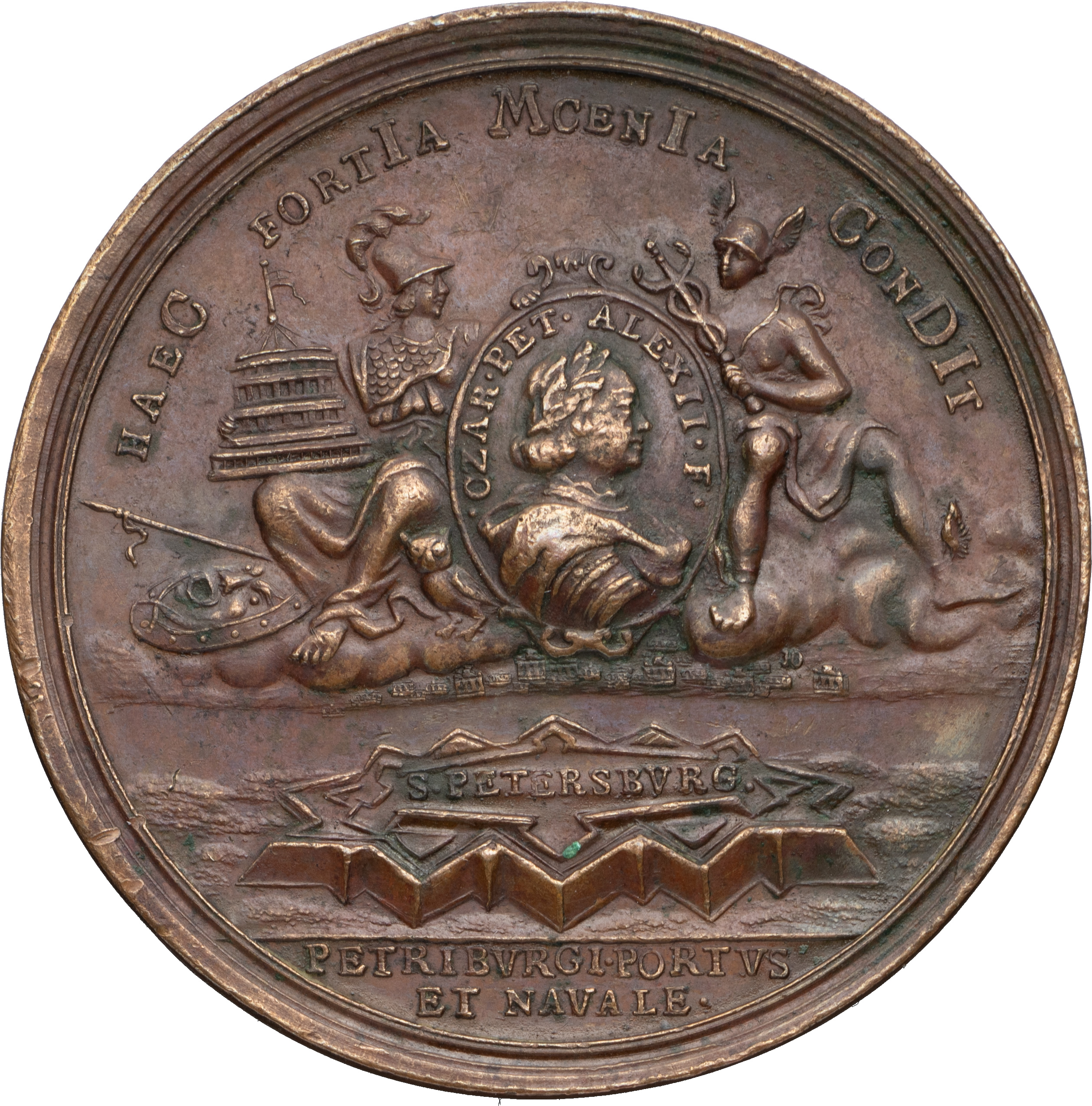 Медаль в память основания С.-Петербурга, 16 мая 1703 г., из серии медалей на события Северной войны. СПб монетный двор. Медальер С.Ю. Юдин (лиц. ст. — на обрезе изображения: С.Ю., об. ст. — вблизи правой ноги Меркурия: Ю). Бронза; 53,27 г. Диаметр 47,7-48,0 мм (овальность). Иверсен# XVI.1.е. Дьяков# 18.8. Великие Русские победы в медали и гравюре# 25. Аналог см. Смирнов# 168. Сохранность почти отличная. Довольно редкая. Надписи на об. ст. медали (лат.): вверху — «HAEC FORTIA MCENIA CONDIT» (Основывает эти крепкие стены, хронограмма 1703), внизу под обрезом изображения — «PETRIBVRGI•PORTVS / ET NAVALE•» (Гавань и корабельная верфь Петербурга).