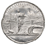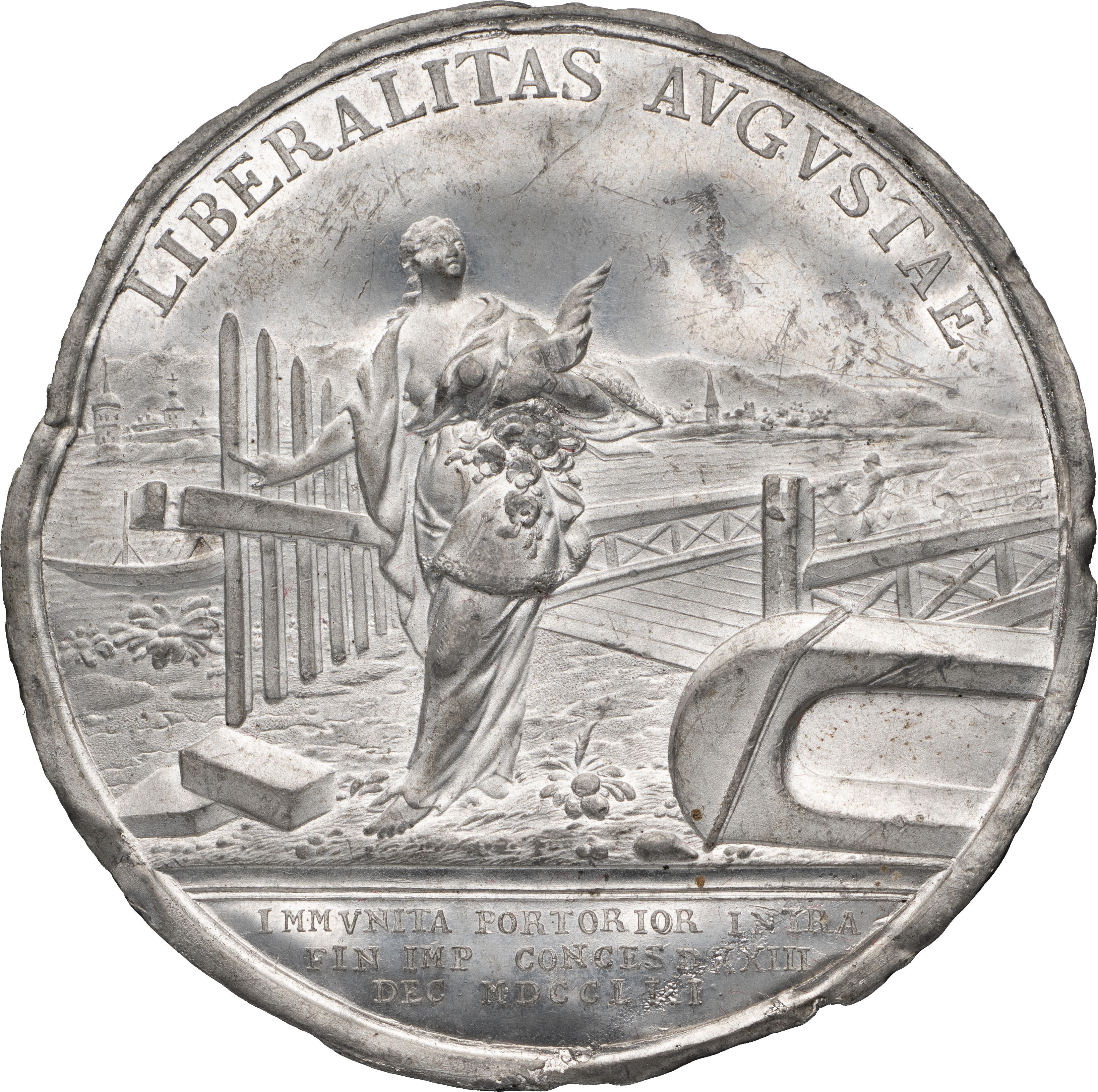 Надписи (лат.): вверху — «LIBERALITAS AVGVSTAE» (Щедростью Императрицы), внизу под обрезом — «IMMVNITA PORTORIOR INTRA / FIN IMP CONCES D XXIII / DEC MDCCLIII» (Внутри Государства заставы открыты 23 декабря 1753 г.).