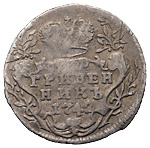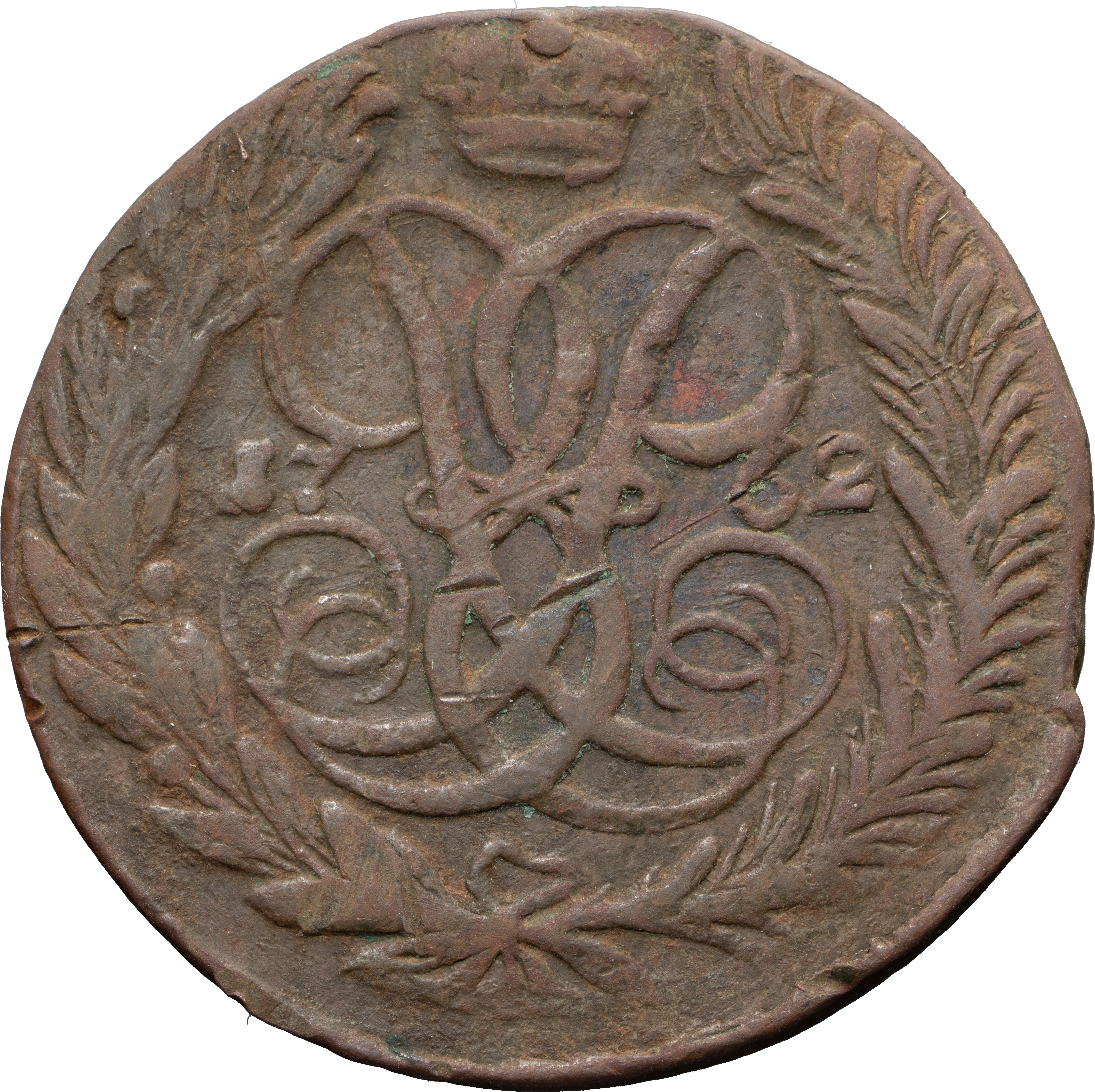 1 копейка 1757 года, без обозначения монетного двора (Сестрорецкий монетный двор). Гурт сетка. Медь, 9,68 г. Сохранность очень хорошая, темная рыхлая патина. ГМ# 16.4. Brekke# 72. Уздеников# 2578. Дьяков# 474. Биткин# 546.