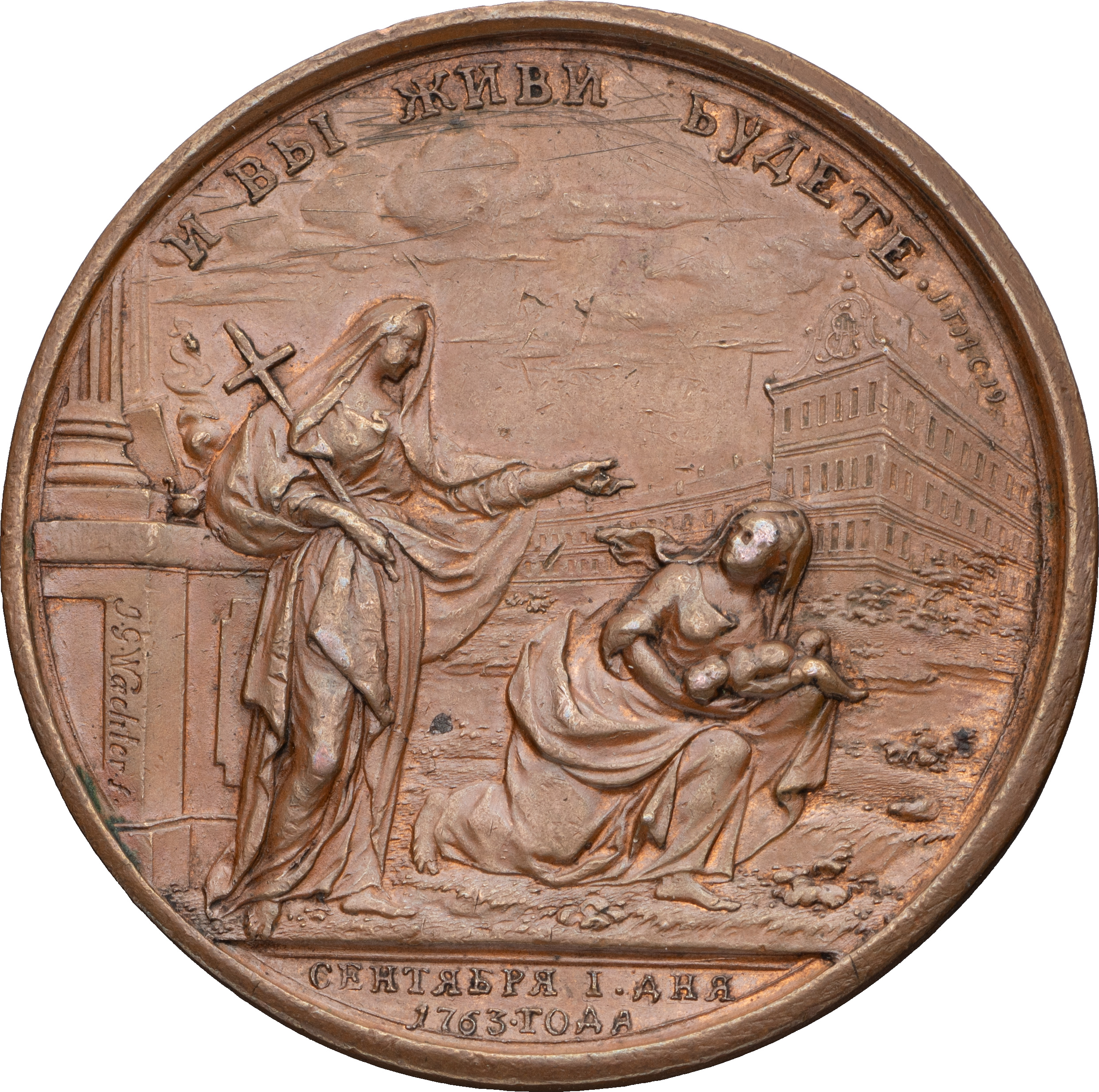 Медаль в память учреждения Московского Воспитательного дома, 1 сентября 1763 г. СПб монетный двор. Медальеры: лиц. ст. — Т.И. Иванов (под обрезом изображения: ТИМОӨЕИ ÏВАНОВЪ), об. ст. — И.Г. Вехтер (слева внизу на пьедестале колонны: J•G•Waechter•f•). Бронза; 59,06 г. Диаметр 51,1-51,6 мм (овальность). СРМ# 149. Смирнов# 248/а. Дьяков# 123.3. Сохранность почти отличная. Довольно редкая.