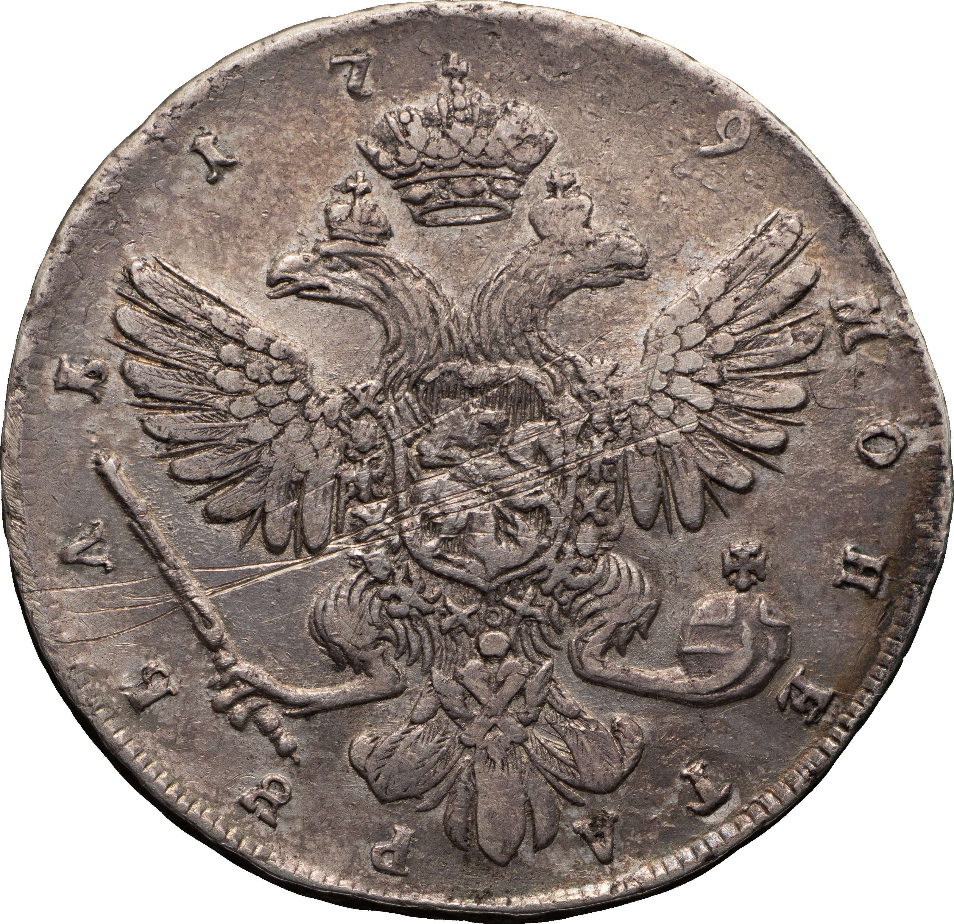 1 рубль 1739 года, СПБ. Лиц. ст.: портрет без броши на плече. Об. ст.: цифры даты широко расставлены. Серебро, 25,85 г. Сохранность очень хорошая, патина, царапины. ГМ# нет. Severin# 1306. Уздеников# 0740. Дьяков# 5. Биткин# 236. Полуйко# 39,7-9. Довольно редкий, 3 рубля по Петрову.