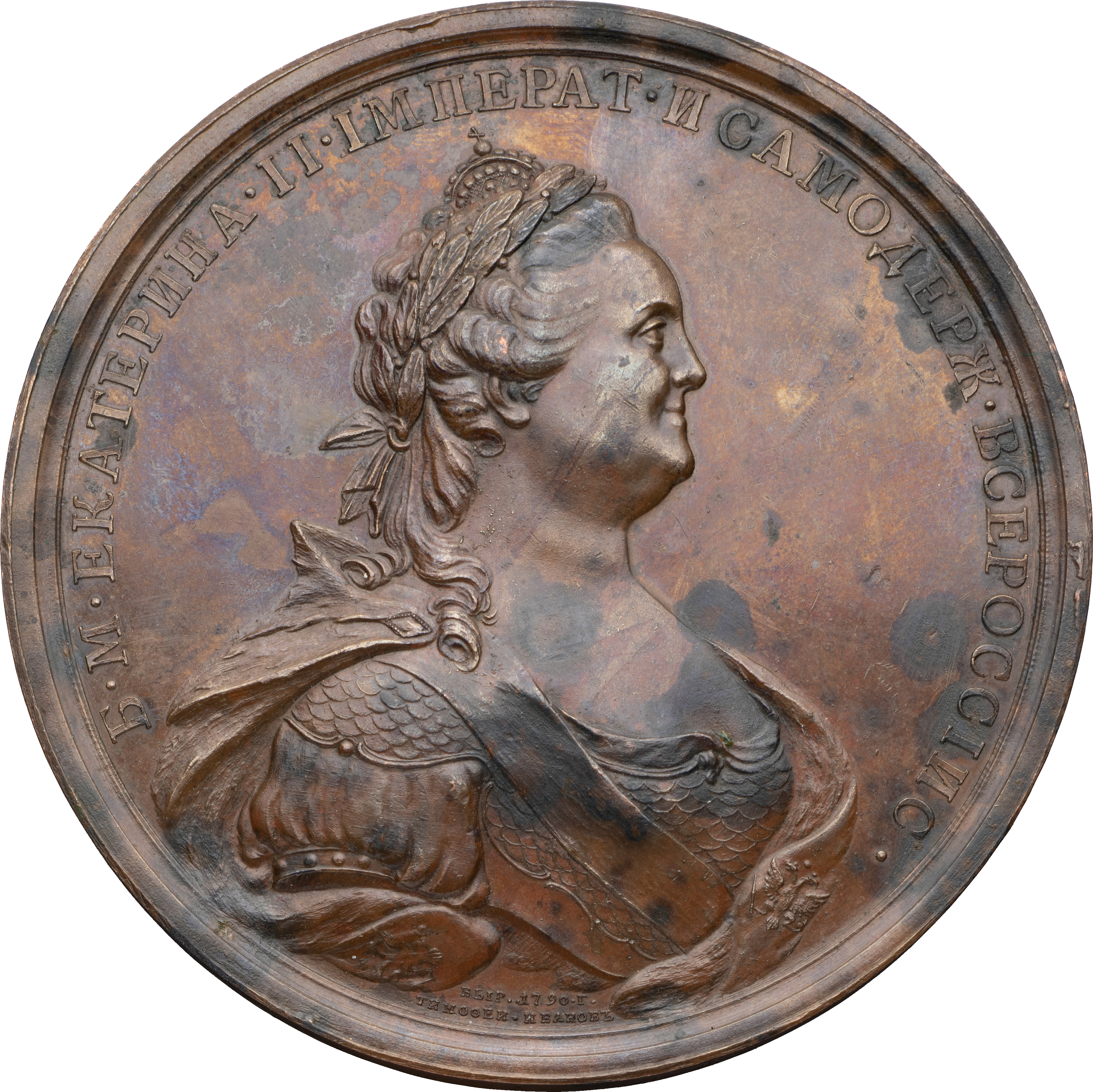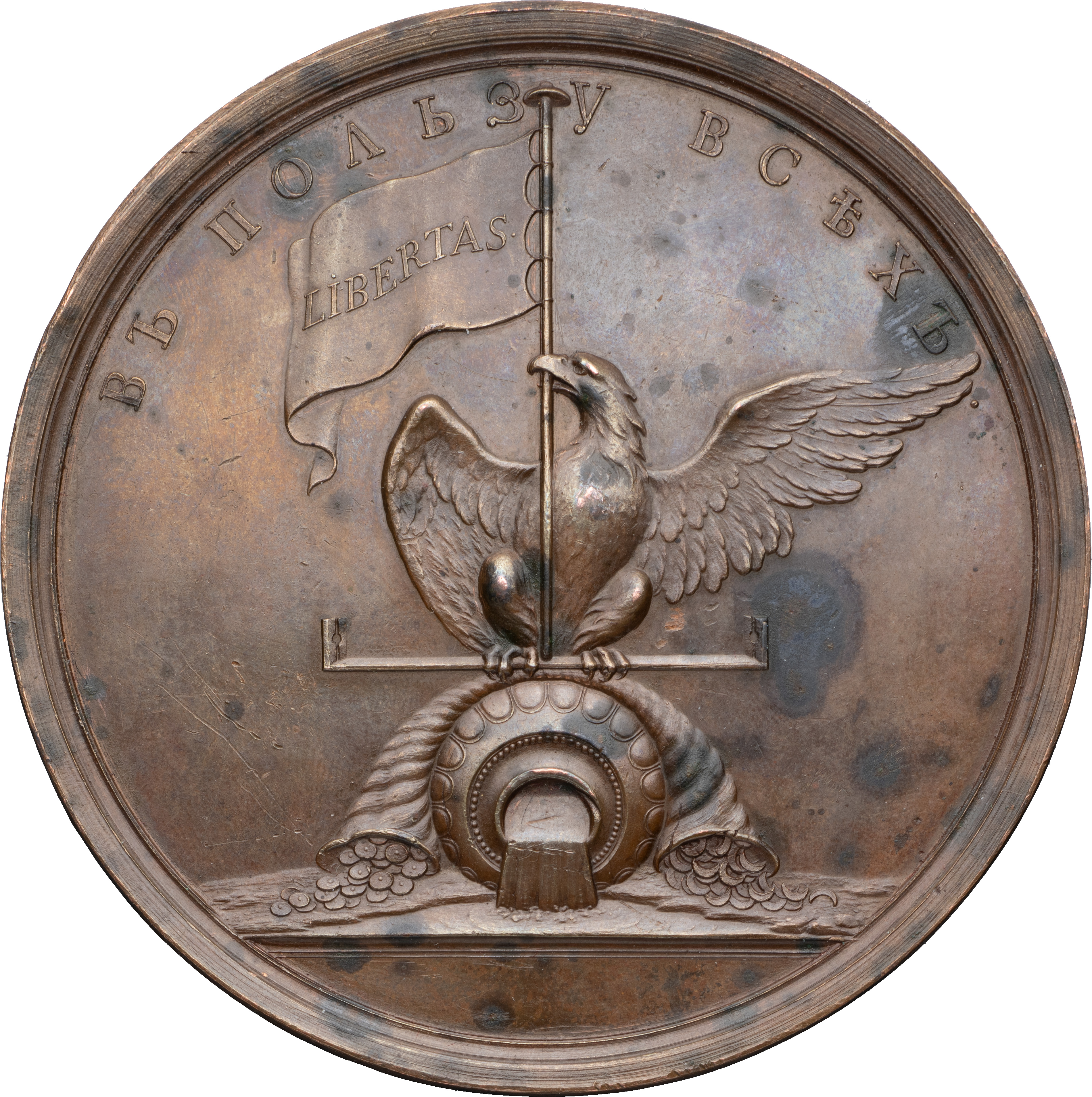 Медаль в память распространения права собственности. СПб монетный двор, конец XVIII в. Медальер лиц. ст. Т.И. Иванов (внизу на поле в две строки: ВЫР•1790•Г• / ТИМОѲЕИ•ИВАНОВЪ). Бронза; 192,57 г. Диаметр 78,8 мм. СРМ# 202. Смирнов# 301. Дьяков# 202.1 (R1). Сохранность очень хорошая, неровности патины. Довольно редкая.