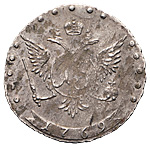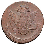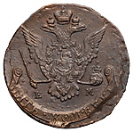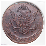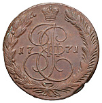 5 копеек 1771 года, ЕМ. Медь, 54,04 г. Лиц. ст.: орел нового образца. Значительный дефект гурчения заготовки. Сохранность очень хорошая. ГМ# 13.2. Brekke# 229. Уздеников# 2718. Дьяков# 269. Биткин# 620А.