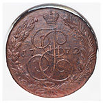 5 копеек 1772 года, ЕМ. Медь. Монета в пластиковой капсуле (слабе) NGC, MS 61 BN, A. Mashtakov Collection. ГМ# 14.9. Brekke# 230. Уздеников# 2723. Дьяков# 283. Биткин# 621.