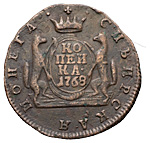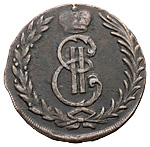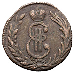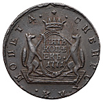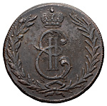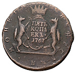 Сибирская монета. 5 копеек 1767 года, без литер КМ. Гурт надпись. Медь, 28,36 г. Сохранность очень хорошая, тёмная патина, следы коррозии. ГМ# 8.8 (редкая). Brekke# 458 (черта с точкой). Уздеников# 4266 (черта). Дьяков# 949 (R3). Биткин# 1058 (R2). Очень редкие, 20 рублей по Ильину, 35 рублей по Петрову.