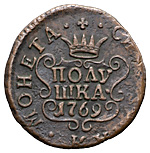 Сибирская монета. Полушка 1769 года, КМ. Медь, 1,87 г. Сохранность очень хорошая, приятная патина. ГМ# 11.6. Brekke# 326 (точка). Уздеников# 4285. Дьяков# 985. Биткин# 1212 (R). Редкая, 1 рубль 25 копеек по Петрову.
