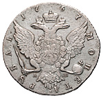 1 рубль 1767 года, СПБ-TI-АШ. Серебро, 23,53 г. Сохранность хорошая, следы чистки и реставрации поля. ГМ# 7.10. Severin# 1993. Уздеников# 0993. Дьяков# 163. Биткин# 201. 2 рубля 50 копеек по Петрову.