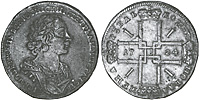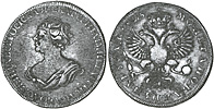 1 рубль 1724 г. Без знака гравера, портрет погрудный. Серебро, 27,76 гр. Сохранность прекрасный VF. Узд#0617.