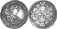 1 рубль 1723 г. ОК. «Тигровик». Портрет поясной. Серебро, 27,81 гр. Сохранность прекрасный VF. Узд#0606.