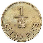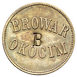 Жетон пивной в Окочиме на 1/2 литра пива. Бронза, 6,71 г. Сохранность очень хорошая, с надчеканкой «B» на аверсе.