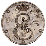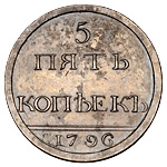 5 копеек 1796 года, с вензелем Императрицы Екатерины II. Пробные. Вензель не украшен. Гурт гладкий, чекан в кольце. Неутвержденный вариант нового образца 32-рублевой монетной стопы. Медь, 25,47 г. Сохранность почти отличная, неровности патины. ГМ# см. 35.2 (Ед.), вар аверса. Brekke# N 27А (черта с двумя точками). Уздеников# 2918 (!!), вар. аверса. Дьяков# 855 (R5), вар. аверса. Биткин# 993 (Un). Исключительно редкие.