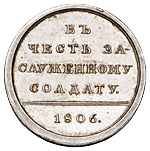Медаль «В честь заслуженному солдату», новодел. СПб монетный двор. Медальер лиц. ст. В.Е.Алексеев (справа над обрезом: А). Серебро, 4,02 г. Диаметр 17,9 мм. Сохранность близкая к превосходной. СРМ# 267. Смирнов# 352/а. Петерс# 25. Дьяков# 306.1 (R4). Биткин# Н575 (R2). Очень редкая. С экспертным заключением за подписью С.С.Левина от 12 февраля 2007 г.