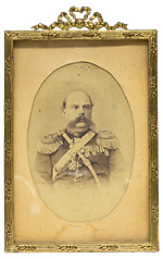 Фотография подполковника 6-го драгунского Глуховского полка Н.К. Богданова. Российская Империя, 1875 г. Неизвестное фотоателье. Размеры в художественной рамке из бронзы под стеклом 184,0×115,0 мм. На об. ст. фотографии — надпись: «Мой дядя Ник. Конст. Богдановъ». Сохранность почти отличная. Довольно редкая. Фотография дополнена машинописной копией с краткой биографией генерал-майора в отставке Н.К. Богданова, составленной его племянником Б.Третьяковым, на 1 листе.