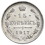15 копеек 1917 года, ВС. Серебро, 2,73 г. Сохранность отличная. Severin# 4201 (черта с точкой). Уздеников# 2224. Биткин# 144 (R). Казаков# 525. Довольно редкие.