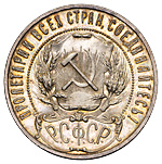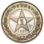 1 рубль 1921 года, АГ. Полированный чекан. Лиц. ст.: шт.1.2 — с полуточкой. Серебро, 19,96. Сохранность полированная, прекрасная, красивая патина. Петров, Федорин# 1 (Р-2). ФедоринVI# 2 (П). Очень редкий.