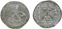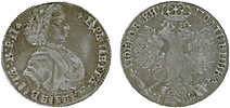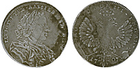 1 рубль 1705 г. МД. Об. ст.: корона закрытая. Серебро, 28,13 гр. Сохранность прекрасный VF. Узд#0485 (•). Severin#179 (—). ГМ№589.