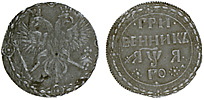 Бородовой знак 1705 г. Новодел. Медь, 4,50 гр. Сохранность XF. Brekke#4 (•). Редкий.