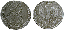 Полтина 1707 г. Об. ст.: обозначение даты славянскими буквами. Серебро, 14,33 гр. Сохранность VF. Узд#0508 (—). ГМ№908. Редкая.