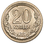 20 копеек 1953 года. Пробные. Лиц. ст.: тип I — с круговой надписью вокруг герба СССР. Об. ст.: тип IIб — цифры даты в картуше, вдоль канта мелкоштриховой ободок, над цифрами номинала нет звезды. Медно-цинково-никелевый сплав светло-желтого цвета, 3,66 г. Сохранность почти отличная. Ушаков, Федорин# 120 (Р4). ФедоринVI, Приложение 6, С.446.1. Крайне редкие.