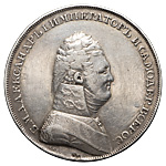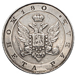 1 рубль 180 (1806) года, LEBERECHT F. Пробный. Новодел. Лиц. ст.: портрет Императора Александра I в мундире Лейб-гвардии Преображенского полка. Гурт гладкий. Серебро, 21,64 г. Сохранность очень хорошая, чистка, подгравировка деталей рисунка. ГМ# 5.4 (редкая). Severin# N 2565 (черта с двумя точками) RRR. Уздеников# Н 2227 (черта с точкой). Биткин# Н 667 (R2). Очень редкий, 100 рублей по Ильину.