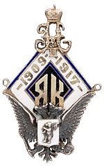 Жетон Ярославского кадетского корпуса. Россия, 1917 г. Неизвестная мастерская. Без клейм. Серебро, позолота, оксидирование, эмаль, 14,17 г. Размеры 44,0×27,2 мм. Сохранность почти отличная, мелкие поверхностные сколы на эмали, цепочка отсутствует. Селиванов# 474. Принадлежал Н.С.Новицкому. Гравировка на об. ст. жетона: «Николай — Сергѣевичъ / Новицкiй». Редкий.