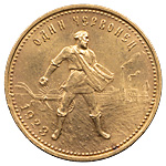 Один червонец 1923 года, ПЛ. Золото, 8,60 г. Сохранность отличная, лёгкая патина, штемпельный блеск. Петров, Федорин# 15 (Р). ФедоринVI# 1. Довольно редкий.