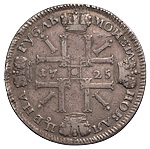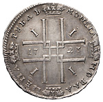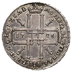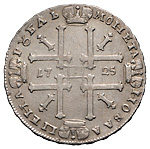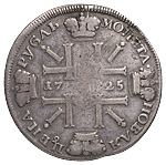 1 рубль 1725 года, без знака гравера. Лиц. ст.: портрет погрудный. Об. ст.: верхние кресты корон располагаются снаружи каждой короны. Гурт: «*РОССИСКОI **РУБЛЬ * ОСКОВСКОГО ** ДВАРА*». Серебро, 27,20 г. Сохранность отличная, плотная патина. Severin# 680–683. Уздеников# 0625. Дьяков# 46, вар. ДьяковЗС# 1596 (R1). Биткин# 973–982, вар. 2 рубля по Петрову.