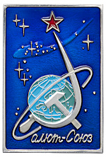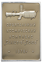 2. Вымпел орбитального космического комплекса «Салют-6» — «Союз». ЛМД, 1978 г. Худ. Г.А. Балашова. Алюминий, эмаль; 47,03 г. Размеры 80,9×54,6 мм. «Энергия», с. 728.