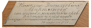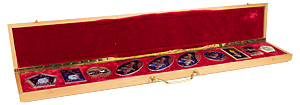 Вымпелы помещены в оригинальный подарочный футляр из дерева, с замками и ручкой для переноски, на подложке из бархата с ложементами. На крышке коробки прикреплена металлическая пластинка с надписью «Николаю Васильевичу / Мартынову / от ученых, конструкторов, / рабочих и служащих / ракетно-космической промышленности / 26 апреля 1980 г.». Сохранность коробки и предметов отличная. Редкий комплект.