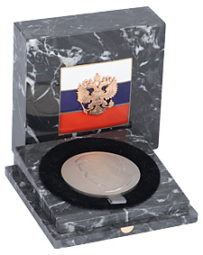 Медаль Президента России с изображением Б.Н.Ельцина в память о церемонии инаугурации, 9 августа 1996 г. Российская Федерация. Санкт-Петербург, АО «Русские самоцветы». 1996 г. Платина 950-й пробы (на гурте: Pt950); 92,74 г. Диаметр 45,2 мм. Полированный шрифт легенды реверса. На гурте электроискровым способом нанесен порядковый номер медали — «NO4». Медаль вложена в оригинальный подарочный футляр из уральской яшмы с накладным изображением герба Российской Федерации на фоне эмалевой вставки цветов государственного флага России и в оригинальную упаковочную коробку из тисненого картона; снабжена сертификатом подлинности от аналогичного экземпляра медали с номером 5. Тираж 6 экз. Сохранность отличная. Очень редкая.