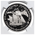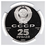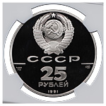 25 рублей 1991 года, ЛМД. «250 лет открытия Русской Америки. Гавань трех Святителей 1784 г.». Палладий. Монета в пластиковой капсуле (слабе) NGC, PF 69 ULTRA CAMEO.