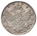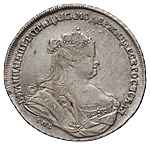 1 рубль 1738 года. Лиц. ст.: портрет работы Л. Дмитриева, пять жемчужин в волосах. Об. ст.: цифры даты сближены. Серебро, 26,05 г. Сохранность очень хорошая, приятная старая патина, дефект заготовки. ГМ# нет. Severin# 1274. Уздеников# 0736. Дьяков# 5. Полуйко# 38.9, 520. Биткин# 202. 3 рубля по Петрову.