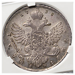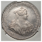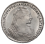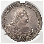 1 рубль 1738 года. Лиц. ст.: портрет работы Л. Дмитриева, пять жемчужин в волосах. Об. ст.: цифры даты сближены. Серебро. Монета в пластиковой капсуле (слабе) ННР, MS 62, из коллекции Радзивилла. ГМ# 12.14. Severin# 1274. Уздеников# 0736. Дьяков# 4. Биткин# 202. Довольно редкий, 3 рубля по Петрову.