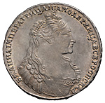 1 рубль 1736 года. Лиц. ст.: портрет без кулона на груди, без лент на левом плече. Серебро, 25,19 г. Сохранность отличная, лёгкая патина, штемпельный блеск. ГМ# 10.1, вар. Severin# 1222 (точка). Уздеников# 0726. Дьяков# 1, вар. Биткин# 125, вар. Полуйко# 36.9, 395, вар. 3 рубля по Петрову.