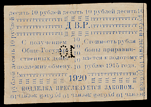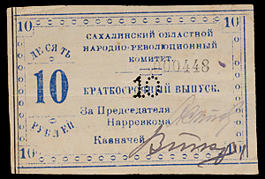 Сахалинский Областной Народно-Революционный Комитет (село Кербь). Краткосрочный выпуск бон в золотом исчислении. Бона 10 рублей 1920 года