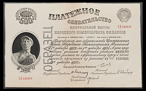 Платежное обязательство центральной кассы Народного Комиссариата Финансов РСФСР. 500 рублей золотом 1923 года