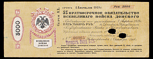 Всевеликое Войско Донское, г. Таганрог. 5 % Краткосрочное Обязательство 5000 рублей 1919 года